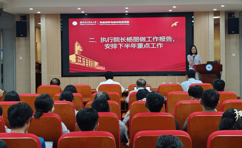 执行院长杨丽作学院工作总结与形势分析报告。她指出,在全院师生共同努力下,陕西省重点实验室顺利通过验收;新增电子信息材料、智能材料与结构2个本科专业并实现招生;打造多门核心课程,8本编著教材入选教育部规划教材;持续推行“一对一导师制”和“班主任制度”,2024级师班建设成效显著,高级职称比例和海外留学经历教师占比均提升等。关于下半年工作,她指出:一是聚力科研攻坚,聚焦“十四五”收官与“十五五”规划,推动科研方向与国家重大需求深度融合,提升国家级项目申报质量,加强有组织科研与产学研合作;二是夯实人才培养,推进电子材料特色课程团队建设,强化“一对一导师制”与课程质量提升,推进工程教育认证,优化实验教学体系;三是加强师资引育,加大高层次人才引进力度,完善青年教师成长机制,鼓励教师申报人才项目与职称晋升;四是深化学风建设,优化班主任制度与学困生帮扶,营造积极向上的学习氛围,提升学生深造率与综合素质。