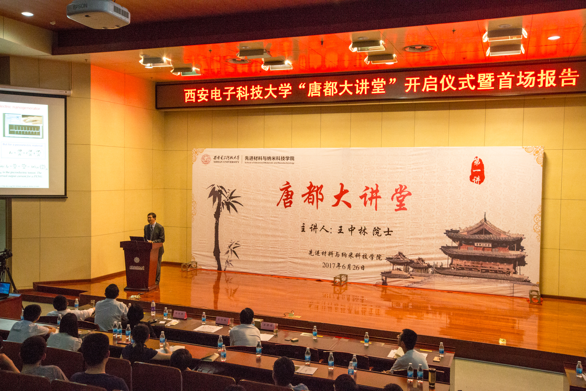 龙建成在主持时表示,材料学院为了进一步开阔西电广大教生的国际化视野,紧跟材料学科的国际前沿,加强学术交流,进一步营造“崇尚学术、追求卓越”“崇尚学术、回归工程”的氛围,精心打造了“唐都大讲堂”。“唐都大讲堂”首讲请到了西电人耳熟能详、引为骄傲的著名纳米科学专家王中林院士。王中林院士一直关心关注母校发展,他的报告扩展了西电师生的视野,他的科学精神令人感动,让人深受启发。