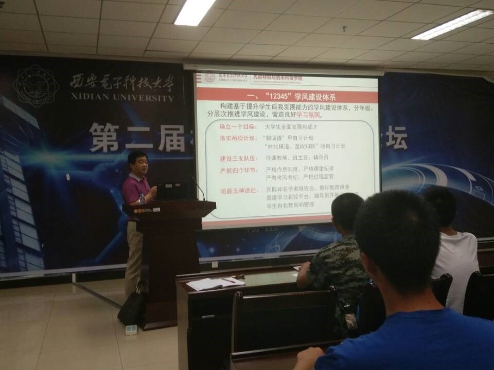 接着,李培咸为新生作了一场别开生面的入学讲座。他从学院的研究方向入手,结合物理化学领域的诺贝尔奖成果,逐步将同学们引入奥妙的科学世界,唤起新生们浓厚的专业兴趣。李培咸从半导体照明、微波功率材料与器件、纳米材料与低维材料、敏感材料与器件与新型电池相关材料等五个研究领域做了清晰扼要的介绍,还与同学一起探讨了“光”的奥秘与应用,并展开了良好的互动交流,为同学们展现了科学的神奇与魅力。李培咸风趣生动的讲解不仅使同学们对专业研究有了深入的认识,也对自己接下来的大学生涯充满了信心。然后,李培咸用更加情怀的方式为新生的大学生涯及人生发展提供了建议。从三个“什么”、四个“学会”入手,引导新生如何学习、做人、做事及与人相处,诠释了成功的路上不仅需要方向、梦想、高度,更需要坚持、合作、充实完善自我,以实现人生的强大,强大到让自己平静与善良,实现真正意义的成功。