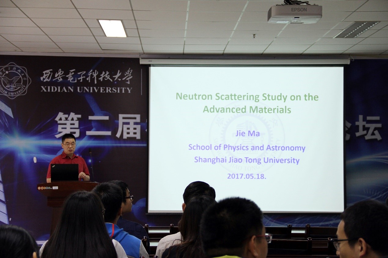 报告伊始,马杰老师简单介绍了个人经历,包括自己所在上海交通大学物理与天文系及美国橡树岭国家实验室的基本情况。接着马杰老师从中子散射的发展历史和研究背景出发,介绍了中子散射实验在材料科学方面的应用,特别提到了我国在中子源研究平台方面的建设情况。随后,马杰老师详细讲解了如何利用中子散射方法测试热电材料PbTe和AgSbTe2的声子谱,并以PbTe为例,解释了利用中子散射实验发现PbTe中声子-声子相互作用导致的声子谱分裂效应。报告中,马杰老师还介绍了利用中子散射方法,研究铁磁材料和反铁磁材料中的磁有序现象,并分享了中子散射在自旋冰、自旋液体、传感器等研究领域的应用。报告会最后,马杰老师同在场师生互动,进行了更加深入的探讨,交流了学术研究经验。