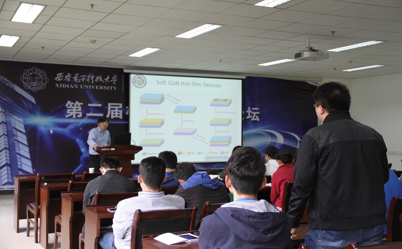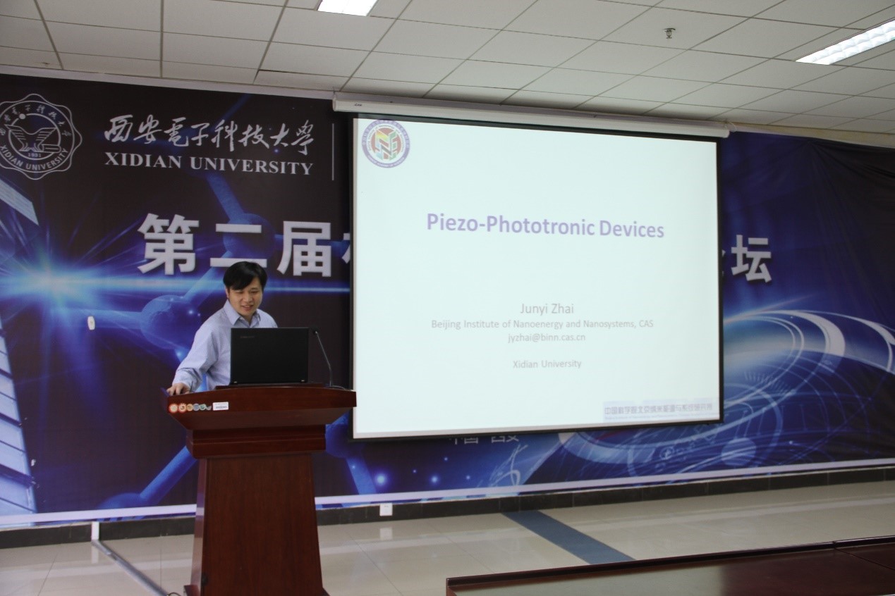 报告会于上午10:00分正式开始。会议伊始,翟老师先简单概述了微型电子器件的两个发展方向。一是遵循摩尔定律不断实现尺寸的降低,二是不断向个性化、便携化和自驱动发展。紧接着翟老师从机电和光电的耦合作用出发,利用简单的模型讲述了压电-电子学和压电-光电子学的原理,细致阐明了压电半导体在应力作用下产生的压电势能够调节半导体材料的导电和发光性能的原因。最后,以他们组的研究成果为例,展现了基于ZnO、GaN和MoS2的应变传感器及光探测器的优异性能,有力地说明了压电电子学和压电光电子学在高灵敏度传感器设计中的重要作用。报告会的最后,翟老师同在场师生进行互动交流,解答了现场师生的疑问,交流了学术研究的经验。