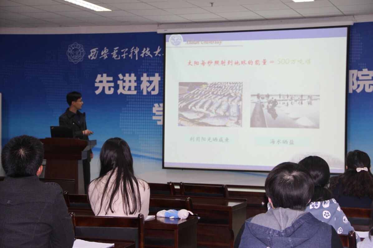 第三代太阳能电池研究现状与发展趋势”,由学院青年教师仲鹏博士主讲。他首先讲述了太阳能电池的发展已经经过了漫长发展历史,先后经历了以单晶硅材料为代表的第一代太阳能电池和以薄膜半导体材料为代表的第二代太阳能电池。为了进一步克服前两代太阳能电池存在的弱点,不断提高电池的光电性能及转换效率,诞生了第三代太阳能电池。其次,讲述了第三代电池的种类、优点和应用领域。重点讲述了染料敏化太阳能和钙钛矿太阳能电池的结构构成和工作原理。并介绍了自己课题组的研究成果和方向。第三代太阳能光伏电池综合了第一、二代太阳能电池的优点,克服了第一代太阳能电池成本较高、第二代薄膜太阳能电池转换效率低的不足,并且具有原材料丰富、无毒、性能稳定耐用、对环境无危害等优点,应用领域非常广泛。其应用已从军事领域、航天领域进入工业、商业、农业、通信、家用电器以及公用设施等部门,尤其可以分散地在边远地区、高山、沙漠、海岛和农村使用,以节省造价很贵的输电线路。最后,指出了第三代太阳能电池的当前应用瓶颈。目前第三代太阳能电池限于实验室研究,它的成本还很高,稳定性不够,因此大规模使用仍然受到限制,仍需大量研究深入探索。