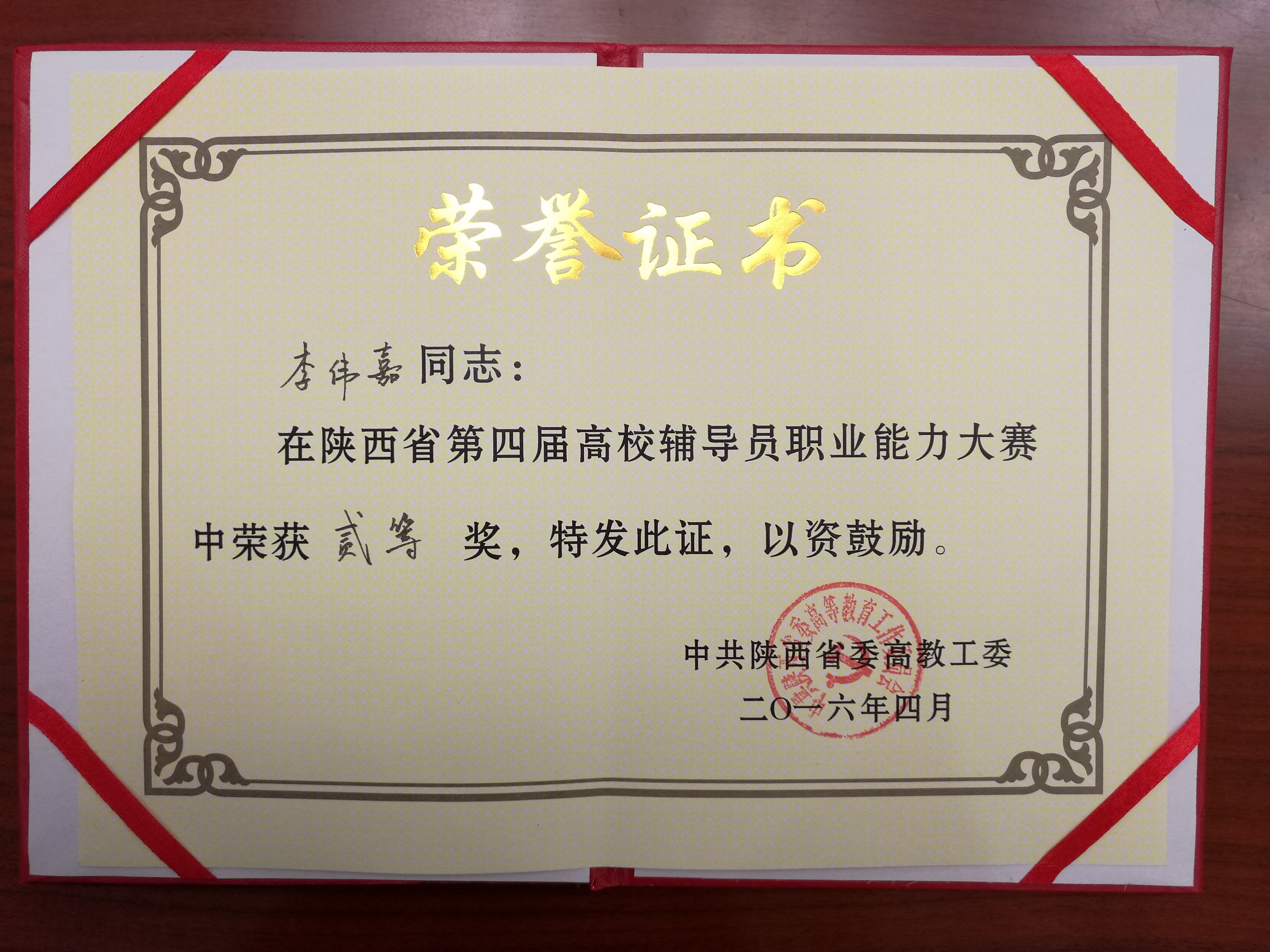 william威廉英国辅导员李伟嘉,于2016年4月,在陕西省第四届高校辅导员职业能力大赛中斩获二等奖殊荣,特此祝贺!