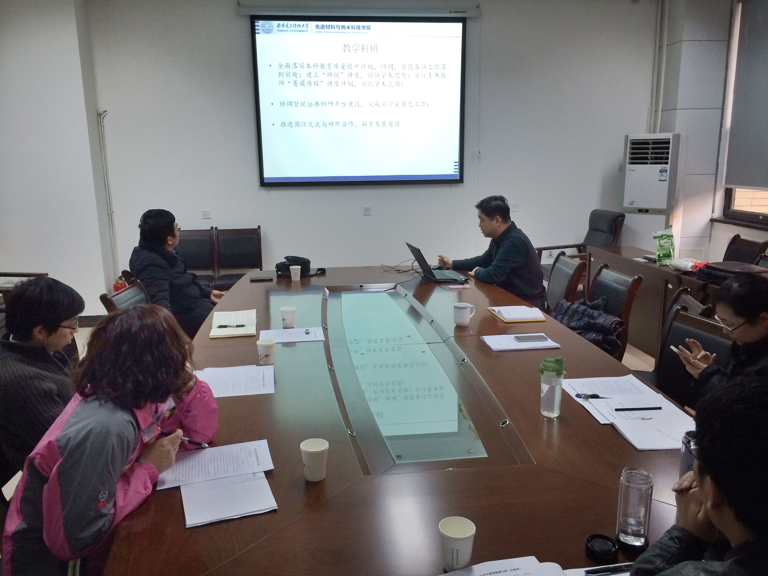 会议开始,首先由院机关成员就2014年度个人工作情况做了总结汇报。他们通过PPT的形式,分别从学院的科研工作、教学工作、人事管理、实验室建设、国资管理、工会工作、党务工作等方面进行了详细的陈述。随后,史小卫针对机关成员的汇报做了点评,他说,学院机关在年终搞一次总结很有必要,尤其是做管理工作,事无巨细,总结就更加重要。这不仅是对个人综合能力的锻炼,也是一次在领导和同事面前展示自己的机会。在平时,希望大家严格要求自己,多进行诸如写作能力、大政方针及理论方面的学习。与此同时,黄伟也对此次汇报进行了点评,他表示,学院机关人员少、任务重,一人身兼多职,在学院成立时间短、各方面工作方兴未艾的情况下能取得这样的成绩难能可贵,同时也希望各位同志在新的一年继续保持机关的优良作风,保质保量的完成各方面工作,百尺竿头、更进一步。最后,学院领导也针对个人年度工作做了简要的陈述,并对机关成员进行了考评,评选张哲同志为年度优秀个人。