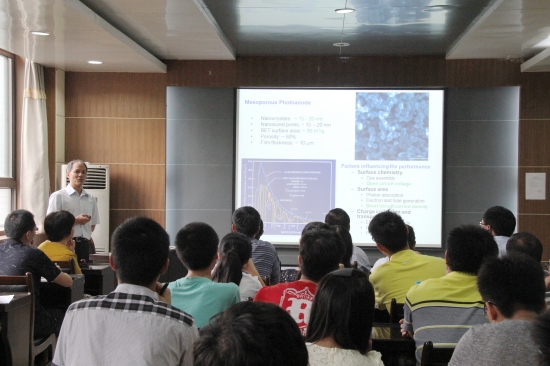 曹国忠教授介绍了其课题组在纳米材料应用于能源转换和存储领域的研究工作,重点从纳米结构光阳极在染料敏化与量子点敏化太阳能电池中的应用、纳米结构 电极在锂离子电池中的应用,以及多孔碳及其表面修饰在超级电容器中的应用等三个方面进行了介绍。william威廉英国50余名师生聆听了报告。报告会 后,曹国忠教授与学院教师进行了座谈交流。