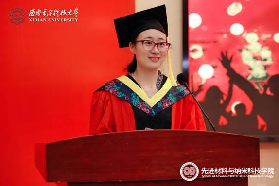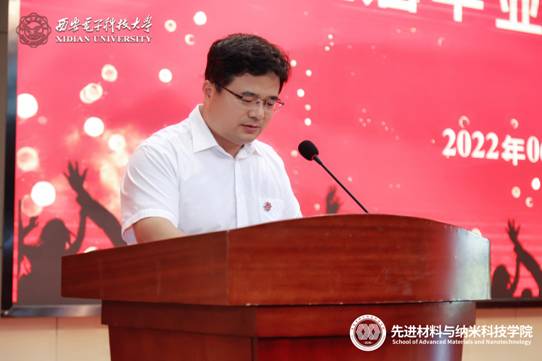 省级青年人才周龙老师作为教师代表发言。他动情的说到:你们中有的人即将奔赴不同的工作岗位,有的进入不同的大学深造学习,不管你们身在何方,请牢记你们是西电的骄傲,是材料学院的骄傲,同时,希望你们坚守初心使命,立国之大志,怀感恩之心,做有用之人,在未来的日子里不忘初心,怀揣梦想,乘风破浪,不负韶华。