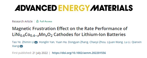 文章信息:Tao Ye, Zhimin Li*, Honglin Yan, Yuan Ha, Dongyan Zhang, Chaoyi Zhou, Lijuan Wang, Lu Li, Qianxin Xiang*. Magnetic frustration effect on the rate performance of LiNi0.6Co0.4-xMnxO2 cathodes for lithium-ion batteries. Adv. Energy Mater. 2022, 2201556
