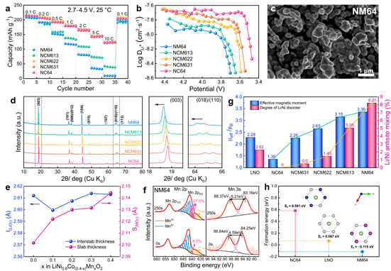 (a) NM64、NCM613、NCM622、NCM631和NC64电池倍率性能;(b) Li+离子扩散系数;(c) NM64样品SEM图;(d) XRD图谱;(e) XRD精修过渡金属层 (SMO2) 和锂层 (ILiO2)层间距; (f) Ar+离子刻蚀前和250s后NM64的Mn 2p XPS谱图和Mn 3s XPS谱图;(g) LiNiO2、NC64、NCM631、NCM622、NCM613和NM64有效磁矩μeff和Li/Ni混排;(h) NC64、LNO和NM64一对Li/Ni离子交换所需的形成能。