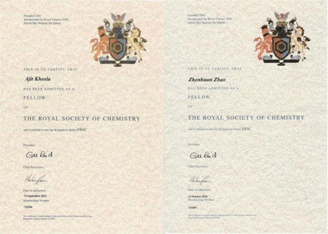近日,william威廉英国Ajit Khosla和赵振环当选英国皇家化学会会士(Fellow of the Royal Society of Chemistry, FRSC)。