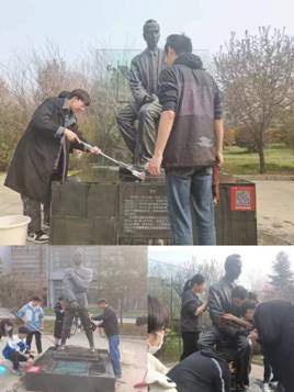 随后,根据分组,同学们携带清洁工具分别对长征路上办学群雕、李白雕像、香农雕像,毕德显雕像进行了细致地擦拭和打扫。女同学们拿起笤帚清扫雕塑周围落叶、灰尘,拿起抹布擦洗雕像底座、低处,男同学们则负责对雕像高处进行清理,他们一丝不苟,不怕脏、不怕累,以实际行动践行了雷锋精神。