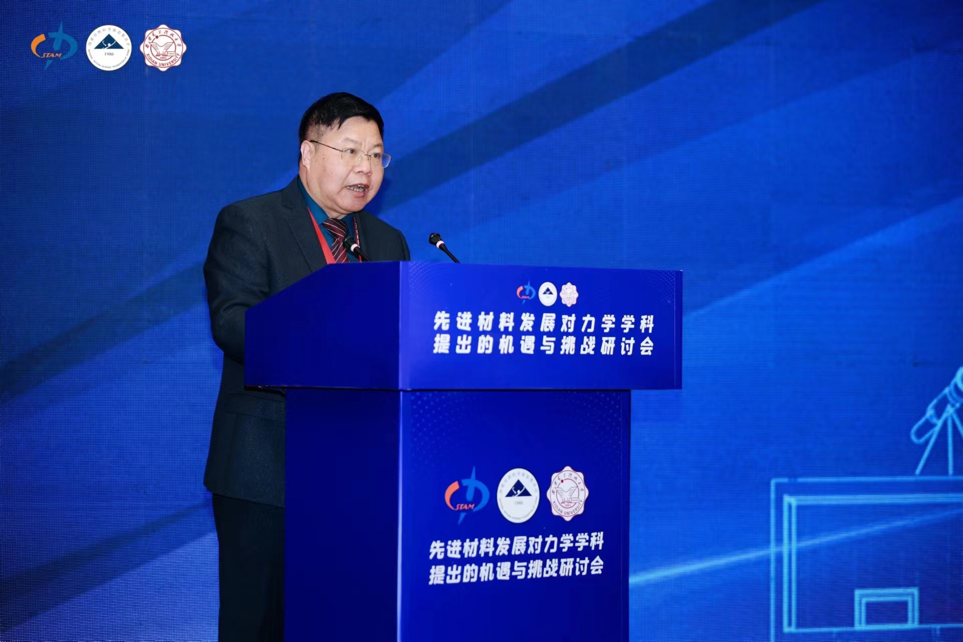 国家自然科学基金委数理学部原副主任孟庆国发表致辞。他简要分析了自然科学基金的新形势,并就力学的原创性基础研究和服务国家重大战略需求两个方面进行了介绍并提出希望。一是自上个世纪90年代以来,我国固体力学研究关注国际前沿热点问题,产生了很多有影响力的成果。但从零到一的原创的成果、引领国际的方向,仍然是短板,希望科研工作者尤其是年轻人能从国家需求出发,大胆提出引领世界前沿的科学问题,潜心开展源头创新的基础研究。二是面对服务国家重大战略需求,力学在各个研究领域中都发挥了重大的作用,解决了不少卡脖子难题,但在国家重大战略中力学的显示度,仍然是痛点与难点,希望力学工作者加强研讨交流,在国家重大战略中力学如何占据主导地位,多做思考,多做探索。