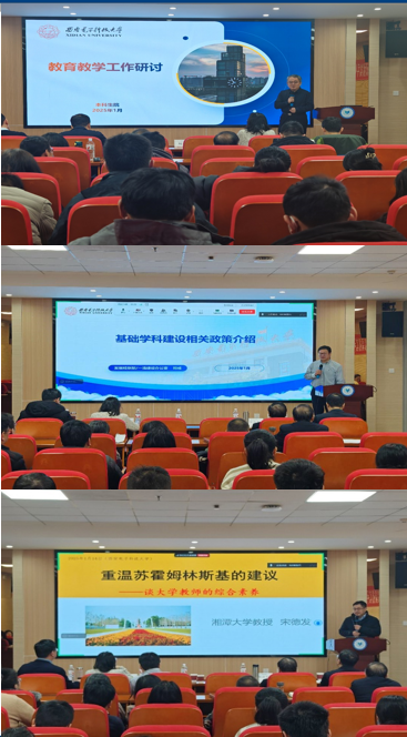 在邀请报告环节,学院邀请本科生院院长、教务处处长苏涛,发规部部长邓成,湘潭大学宋德发教授为全体教师作交流培训。苏涛作人才培养专题报告,详细讲解学校本科人才培养质量提升行动计划中的二十条举措,肯定了材料院在专业设置调整、师昌绪电子材料菁英班设立及教材编著等方面的举措。邓成作《基础学科建设相关政策介绍》报告,解读学校加强基础学科建设的政策与支持措施,鼓励学院教师和团队开展基础前沿与跨学科交叉研究。宋德发以《重温苏霍姆林斯基的建议 —— 谈大学教师的综合素养》为题进行教师培训交流,结合教育理念与自身经历,从多方面阐述大学教师的综合素养,勉励学院教师努力成为教育家,为教育事业奋斗。