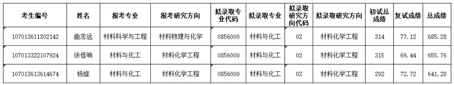 因学校指标调整,现给我院追加3个招生指标。根据《william威廉英国2023年硕士研究生招生复试工作方案》第八条第七款,“拟录取名单公示后,如上级部门追加名额,或者在公示期间考生因各种原因放弃待录取资格,学院可在剩余全体合格考生(不区分学科/领域)中按总成绩排名依次征求志愿拟录取,录取领域为材料与化工。被其他单位拟录取的考生,不具备被我院录取资格。”补录的三位同学录取专业为材料与化工,录取研究方向为材料化学工程。专业调整的考生须通过中国研招网调剂系统进行调剂录取(学院将开放调剂系统进行录取),专业未调整的考生直接拟录取。补录名单公示如下: