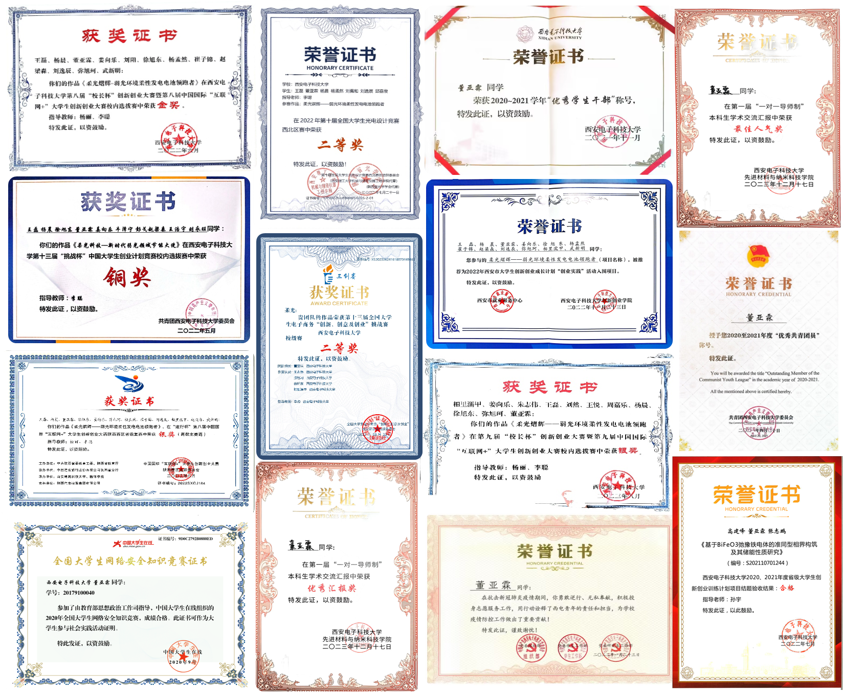 一直以来,董亚霖都很重视课程知识的学习除了课上认真听讲、课后及时复习总结之外,多向老师、同学请教是他最擅长的学习方法。“大学的课程知识比较难,幸好学院的任课老师很负责,常常在课后耐心地解答我们的问题;除此之外,身边优秀的同学也是我学习的榜样,和其他同学的交流更能加深我对知识概念的理解正是有了这些良好的学习习惯,董亚霖在高等数学(97)、场论与复变函数(99)、半导体物理(97)等课程上得到了较高的分数。在课业学习之余,董亚霖也积极参与学科竞赛,将所学的专业知识用于实践,加深对知识的理解和应用,目前已经获得了包括中国国际“互联网+大学生创新创业大赛省级银奖、全国大学生光电设计竞赛省级二等奖等省级及以上奖项5项、校级奖项4