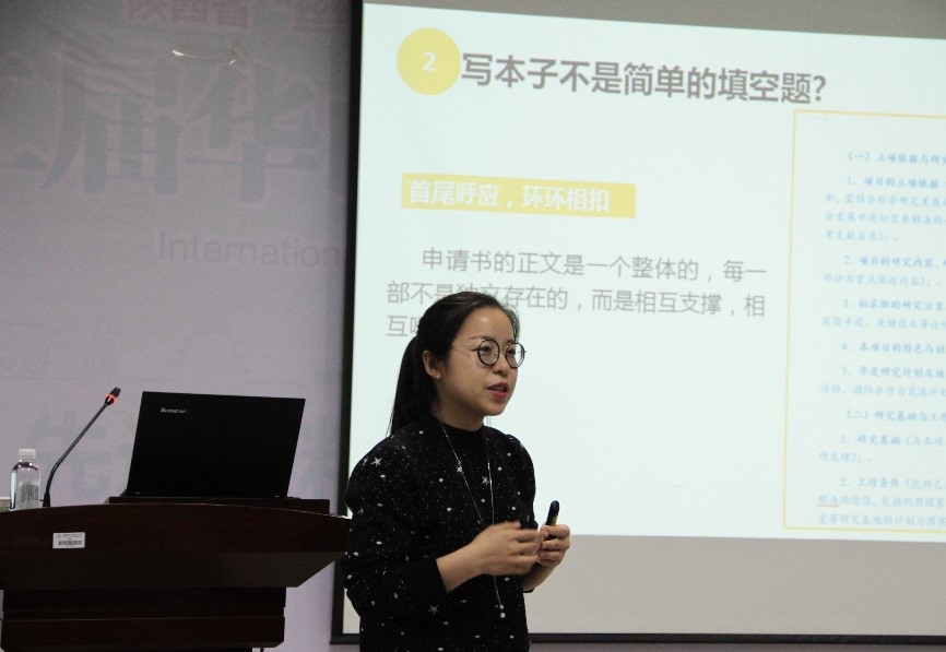 会上,王媛分享了自己申请青年科学基金项目过程中的宝贵经验。她从题目构思,申请书的撰写与修改,至最后提交等方面展开分享;一份好的申请书从构思开始,构思到位,事半功倍;申请书的撰写要在逻辑、条理、语言上多下功夫,要将技术层面的内容上升到科学层面;一份好的申请书需要投入大量的心血去不断修改完善,多听取同行专家的建议;提交之前要预留足够的时间在线填写,需要反复进行检查。