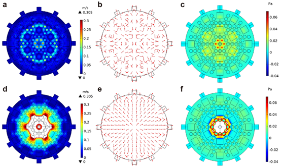 图2有分流装置(上行)与无分流装置(下行)的腔室中传感器阵列附近的速度分布(a,d),归一化速度箭头(b,e)以及压力分布(c,f)。