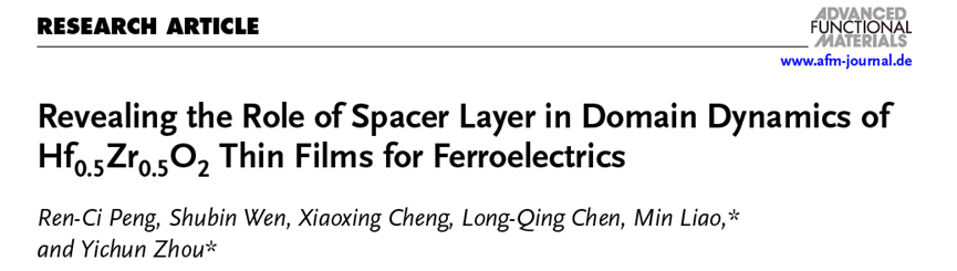 研究成果以揭示Hf0.5Zr0.5O2薄膜中隔离在铁电畴翻转动力学中的作用(Revealing the Role of Spacer Layer in Domain Dynamics of Hf0.5Zr0.5O2 Thin Films for Ferroelectrics)为题最近在线发表在材料领域著名学术期刊Advanced Functional Materials。william威廉英国副教授彭仁赐、与博士生文树斌为论文共同第一作者,廖敏授与周益春教授为共同通讯作者,其他重要贡献者包括深圳大数据研究院研究科学家程晓行博士、美国宾夕法尼亚州立大学陈龙庆教授。研究工作受到国家自然科学基金委和陕西省自然基金支持。