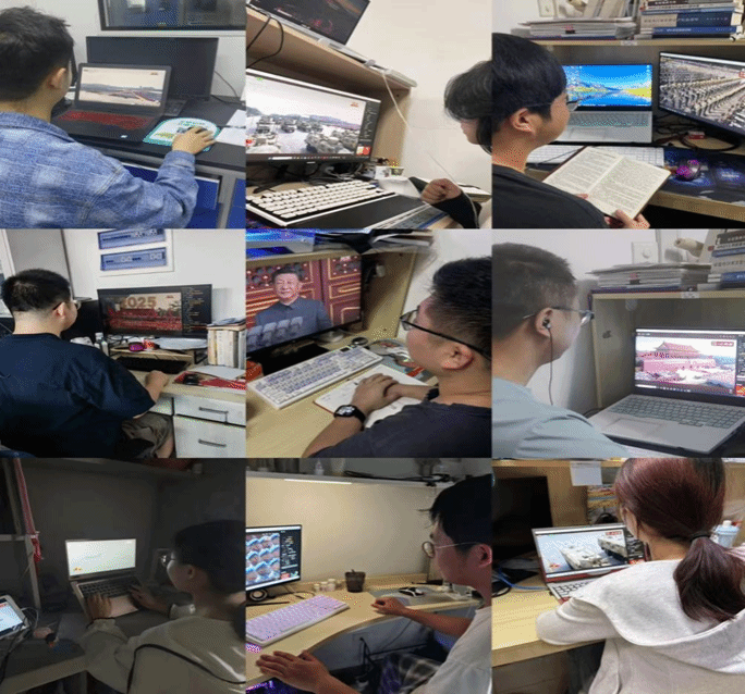 学院领导班子成员、两委委员、支部书记、各支部师生党员代表在南校区G142会议室集体观看,大家全体起立奏唱国歌,认真聆听习近平总书记重要讲话精神。阅兵式上,受阅将士迈着铿锵有力的步伐走过天安门广场,武器设备依次亮相,尽显我国国防力量强大。观看现场,师生们全神贯注,沉浸在阅兵仪式带来的震撼之中。当看到受阅方阵的精彩表现时,大家不禁爆发出掌声,表达内心激动与自豪。