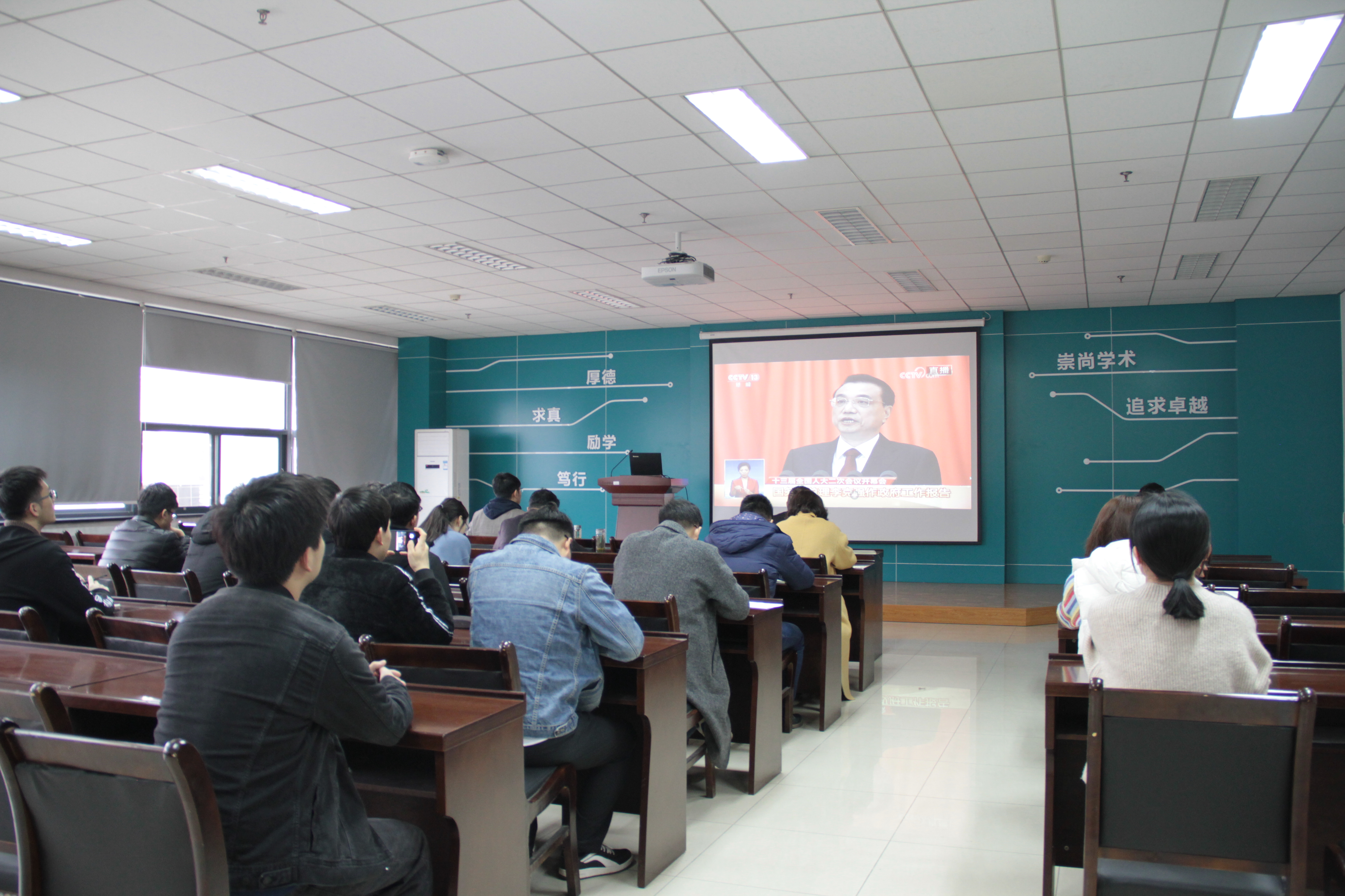 学院青年骨干教师刘菲在收看直播后谈到,之前学院曾多次组织过集体学习活动,每次与大家坐在一起集体收听收看、研讨学习时,都会比自学有更多的收获和感想。今天,李克强总理的政府工作报告简洁又有力,提到了人们普遍关注的诸多社会热点问题,很多新政策、新方案都是实实在在惠及广大人民群众的大红包。报告中肯定了在世界经济普遍发展放缓的形势下的我国经济的发展,也提出了大家关心的科技原创性不足等问题,作为高校教育科研工作者,也倍觉责任之重大,任务之紧迫。