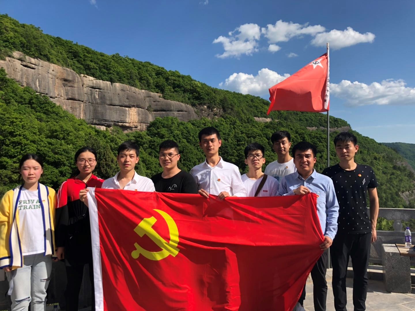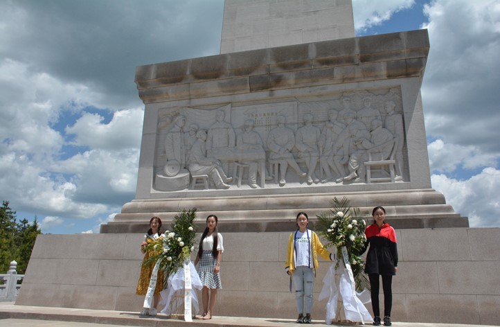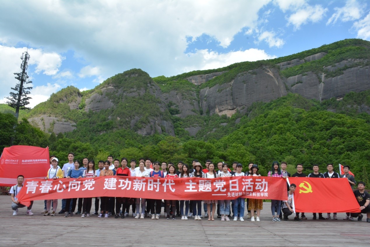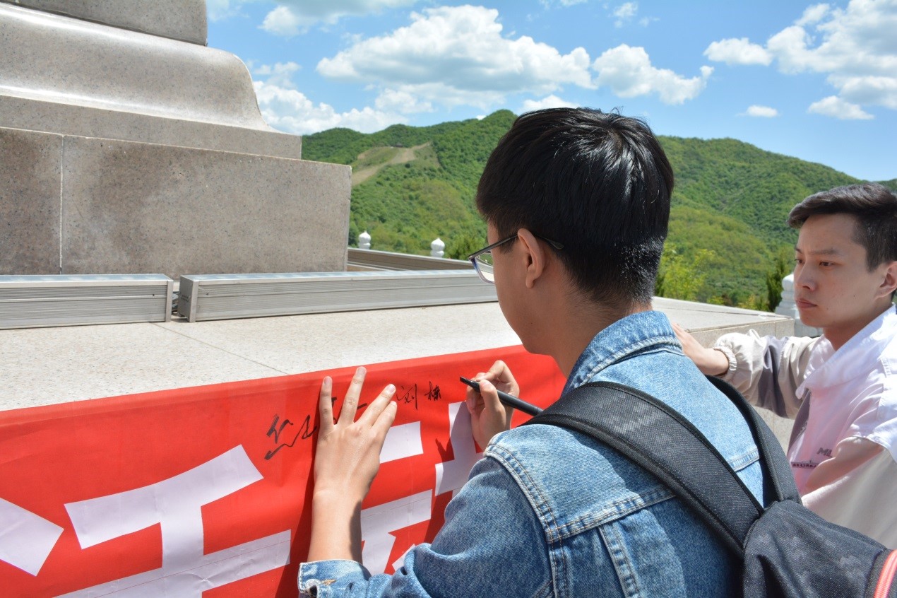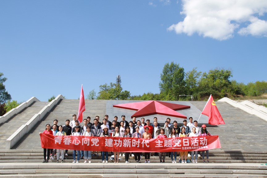 随后,全体学员拾阶而上,在镌有“陕甘边革命根据地的英雄们永垂不朽”16个大字的纪念碑前,开展了“青春心向党,建功新时代”主题党日活动。学员们面向革命先烈鞠躬致敬并敬献花篮。本科生党支部秦毅然和2018级研究生党支部王赛赛作为学生党员代表,分别分享了对习总书记的五四讲话精神的学习感想,他们表示作为大学生党员,要从自身做起,肩负时代使命,树立远大理想,传递五四精神。学院党委副书记程远与大家分享了这次学习参观的感受,强调这次学习吹响了西电材料青年新时代出征的号角,奏响了新时代材料青年的最强音,他号召材料青年向老一辈无产阶级革命家学习,牢记习总书记在五·四讲话中对青年的六点要求,为祖国发展贡献力量。接着,全体党员重温入党誓词,铮铮誓言在纪念碑前久久回荡。最后,全体党员在“青春心向党,建功新时代”主题党日横幅上签字铭志,通过这一系列形式的活动,同学们肩上的责任感和荣誉感大大增强了。