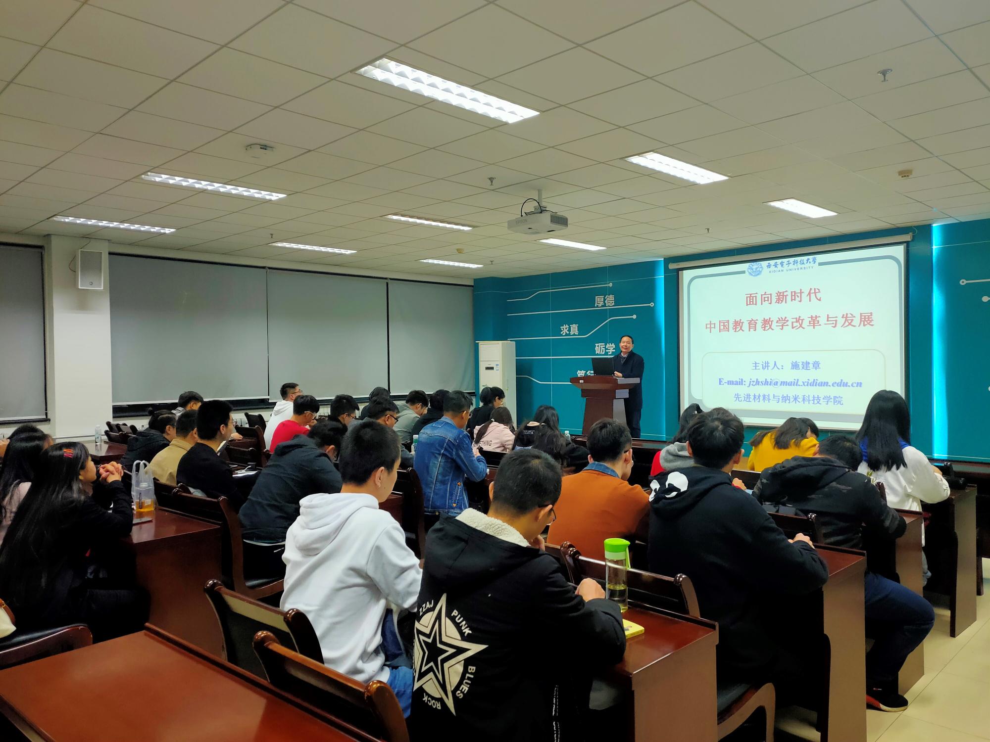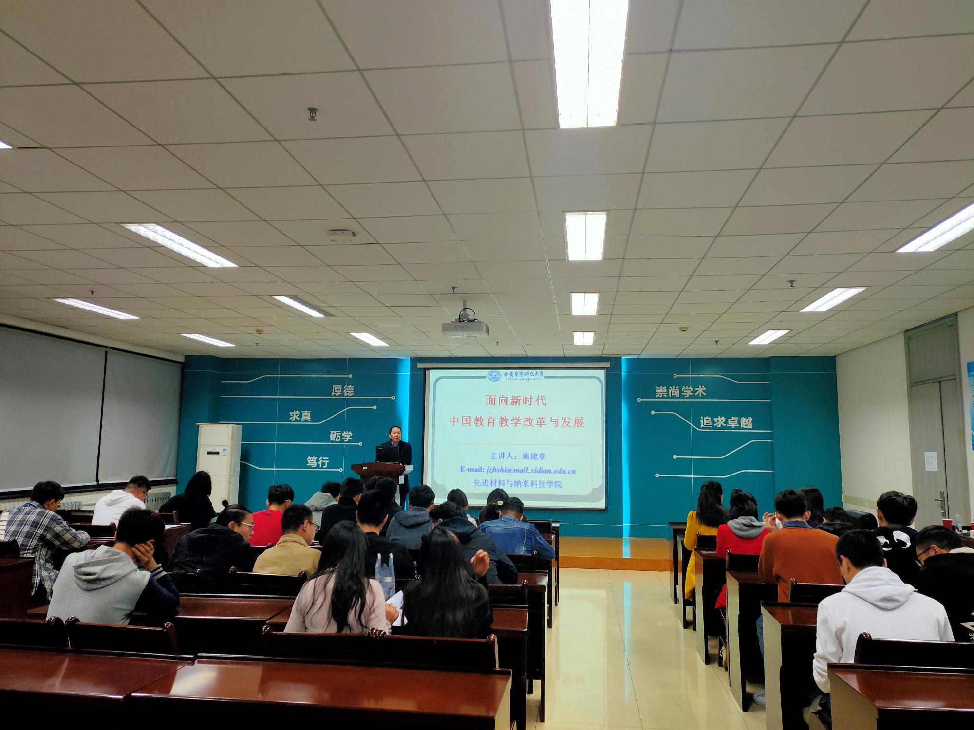 施建章从什么是教育入手,并从中西方的角度进行剖析和对比,称中国更倾向于担任布道者(传授、灌输、记忆),而西方更倾向于充当助产士(启发、讨论、质疑)的角色,中西方的教育各有千秋,均有值得借鉴的地方。他指出教育的四大支柱是素质教育的目标,使学生学会做人、学会求知、学会劳动、学会创造、学会生活、学会健体、学会审美。接着,他强调要认真学习关于教育的几个重要文件,如《习近平在全国教育大会上的重要讲话》。他指出,我们是社会主义教育,要坚持“育人为本,德育为先”的理念,树立正确的世界观、人生观和价值观,坚持弘扬中华优秀传统文化和中华民族奋斗创业史教育。