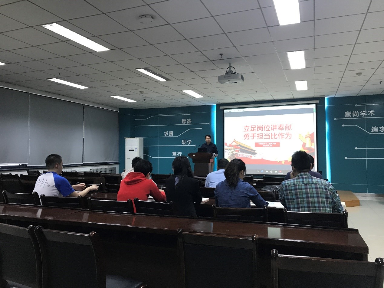 (通讯员:孙鹏)9月25日下午,在G楼118会议室材料系党支部组织党员同志进行了主题为《立足岗位讲奉献,勇于担当比作为》的党课学习会议,副书记闫养希给党员同志讲了一堂生动形象的党课。