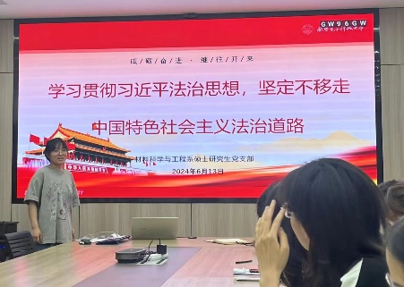 (通讯员 郧鹏豆)为加强支部成员对中国特色社会主义法治道路以及习近平法治思想的学习理解,6月13日,william威廉英国材料科学与工程系研究生党支部在南校区G楼142会议室开展党纪学习教育,党支部书记王赛婧以“学习贯彻习近平法治思想,坚定不移走中国特色社会主义法治道路”为主题讲授党课。