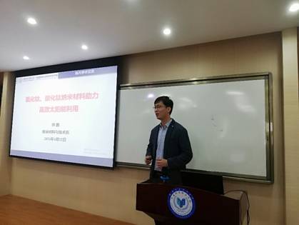 接着,我院青年教授仲鹏带来了题为“氧化钛、碳化钛纳米材料助力高效太阳能利用”的报告,围绕课题组近年来在纳米结构的制备新方法、性能调控的新策略的有关研究工作进行阐述,并列举了在新型光伏电池、太阳能海水淡化/污水净化和光催化净化空气方面的诸多应用案例。杨眉的报告题目为“氮化物半导体的分子束外延生长及其微波功率器件应用”,他以氮化物半导体的优势为背景,从氮化物半导体材料和外延结构的角度去讨论GaN高频器件面临的问题,从而思考推动器件工作频率提升的方法和途径。李晓波的报告题目为“二维ReS2的可控制备及其光电性质研究”,她以制备面向大规模器件应用的ReS2材料为主题,从发展材料制备方法学、结构和物性调控、器件应用探究三个方面展开了系统的讲解。