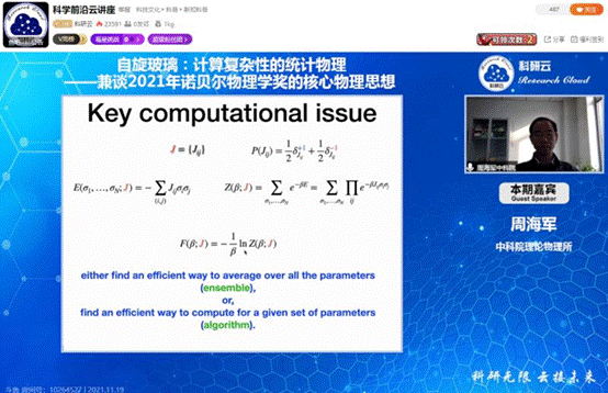 第一场报告《自旋玻璃:计算复杂性的统计物理——兼谈2021年诺贝尔物理学奖的核心物理思想》由周海军研究员带来,他结合2021年诺贝尔物理学奖讲述了自旋玻璃理论对于理解无序自旋相互作用系统的重要作用,介绍了空腔理论和信念传播消息传递算法,并举例讨论该理论在约束满足、组合优化、神经网络等问题中的富有启发性的应用。