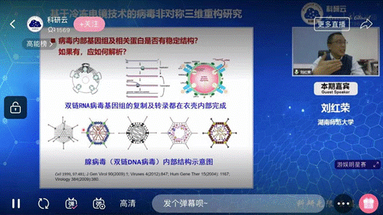 刘红荣教授的报告题目为《基于冷冻电镜技术的病毒非对称三维重构研究》,他讲述了从非对称结构解析方法来探究解析利用冷冻电镜技术得到的病毒颗粒结构,该方法突破了大部分部分病毒对称结构研究的瓶颈,为揭示病毒生命周期的相关分子机制带来了新的思路。最后,刘老师对冷冻电镜技术在纳米材料结构中的应用进行了展望。