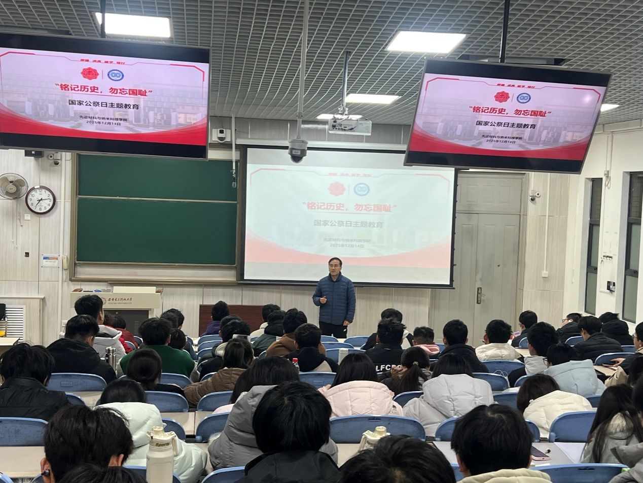 默哀与观影结束后,宋刚锋作总结发言。他阐述了国家设立国家公祭日的重大历史意义与现实价值,指出铭记历史是为了汲取教训、珍视和平、警示未来。他结合学院学科特色与学生实际,向全体同学提出三点期望:一是要勿忘历史,从民族深重苦难中汲取奋进力量,坚定理想信念,筑牢精神根基;二是要珍惜时光,深刻理解和平与发展环境的来之不易,将悲愤之情转化为拼搏动力,珍惜在校学习的每分每秒;三是要努力学习,聚焦先进材料与纳米科技领域前沿,刻苦钻研,掌握过硬本领,立志科技报国,将个人成长融入国家发展与民族复兴的伟大征程中,以实际行动告慰先烈,守护历史真相,捍卫人类尊严,共创美好未来。