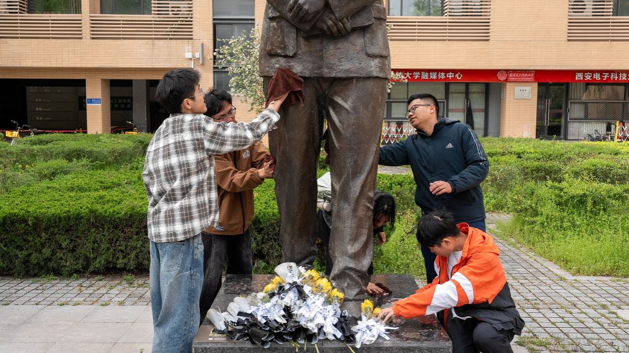 接着,全体学子怀着敬畏之心面向毕德显雕像默哀,缅怀先辈、寄托哀思。默哀毕,同学们依次走向雕像郑重敬献鲜花,将对先辈的崇敬与思念化为真切行动。仪式最后,大家高举右拳,庄严宣誓《中国共产主义青年团入团誓词》:“我志愿加入中国共产主义青年团,坚决拥护中国共产党的领导,遵守团的章程,执行团的决议,履行团员义务,严守团的纪律,勤奋学习,积极工作,吃苦在前,享受在后,为共产主义事业而奋斗。”铿锵有力的誓言彰显新时代西电学子必将为中国式现代化挺膺担当的决心与斗志。