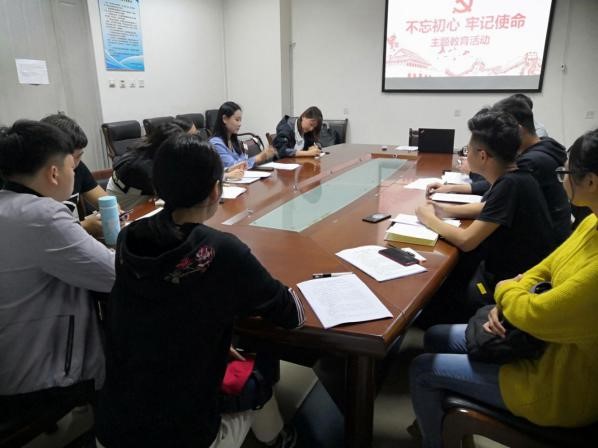 党支部书记王悦介绍了学院党委关于“不忘初心、牢记使命”主题教育的实施方案以及如何开展“我和我的祖国”党日活动。全体党员一起学习了习近平总书记“不忘初心、牢记使命”主题教育工作会议上的重要讲话等内容。各党员发表观点并积极讨论交流,大家纷纷表示作为学生党员,也要把自己的“初心”和国家的“使命”相结合,铭记历史,高扬马克思主义旗帜不动摇,时时刻刻把“初心”和“使命”装在心中。把自己的命运和党的命运紧密联系在一起,敢于担当作为,为国家社会发展贡献力量。