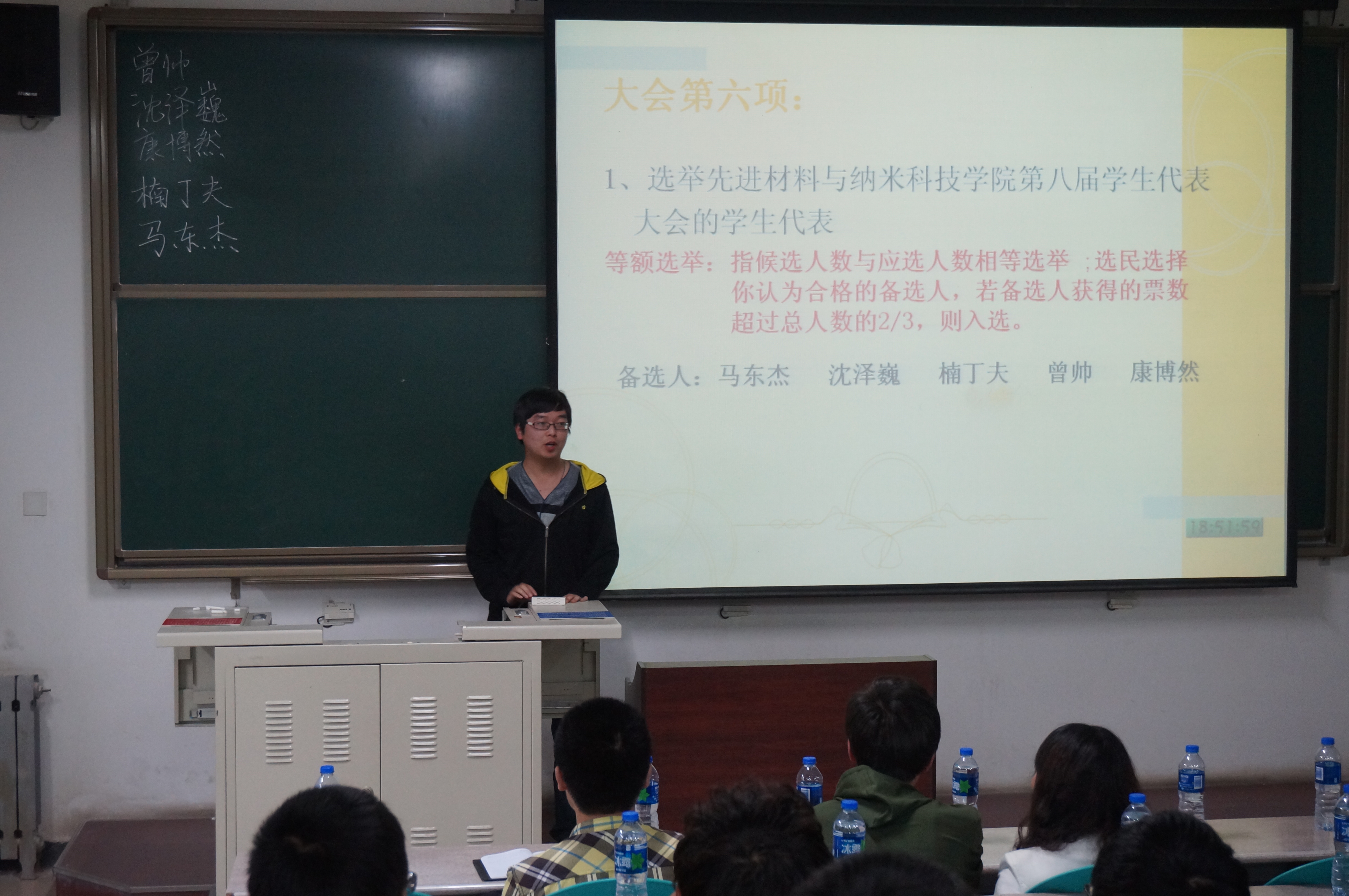出席本次大会的领导与嘉宾有,校学生会副主席边宇凡、院学生会主席郝思远、院学生会副主席马东杰、团委副书记王帅、科协主席沈泽魏、宣传中心主席刘忠其、监选组成员李岚婷以及秦维大一辅导员刘男。出席本次大会的代表人数为86人,出席率为95.6%,缺席4人,达到代表人数4/5以上。本次大会由我院大一学生贺龙主持,本次大会的主要议程是:1.对院学生会工作进行总结与规划。2.听取并表决选举委员会的相关提案。3.选举产生第八届校学生代表。4.选举产生第八届委员会委员候选人。本次大会选举采用等额选举。学生代表候选人分别为曾帅,沈泽巍,康博然,楠丁夫,马东杰。委员候选人分别为曾帅,沈泽巍。本次选举,候选人皆以超过三分之二的票数顺利通过。本次大会的提案主要有12项:1.关于新综合楼恶臭散发问题。2.关于学生公寓中晒被子难问题。3.关于校园垃圾分类处理问题。4.关于宿舍楼前自行车停放不便问题。5.关于学校热水供应问题。6.关于提供前往校医院交通工具问题。7.关于学校安全问题。8.关于学生平时饮食问题。9.关于操场晚上供电时间问题。10.关于宿舍熄灯时间问题。11.关于在校买火车票机票问题。12.关于校园网经常断问题。选举会成员对于这些提案极为关心,在听取于表决中表现非常积极,每一项都受到众选举会成员的强烈认可。