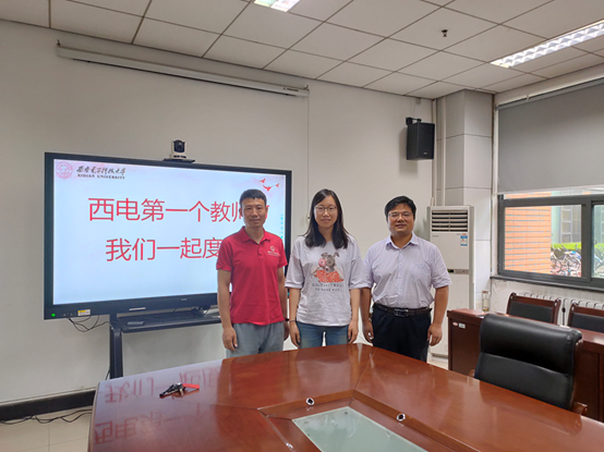 座谈会最后,在“西电第一个教师节,我们一起度过”的背景前,学院班子成员和新进教师合影留念。