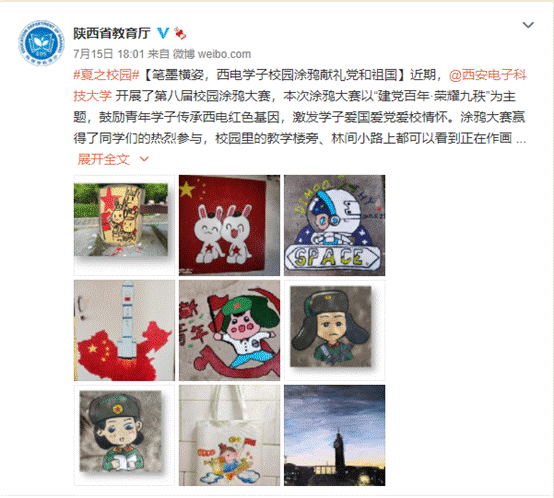 “笔墨横姿,西电学子校园涂鸦献礼党和祖国”,本次涂鸦大赛的成功举办,得到了陕西省教育厅官微转载。