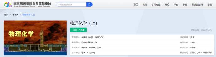 (通讯员 杜小红)3月28日,教育部举行国家智慧教育平台启动仪式并正式运行,WilliamHill体育共有70门课程首批入选。其中,我院梁燕萍教授负责主讲的《物理化学》(上、下)课程上线国家智慧高教平台,也成为我院首批在智慧高教平台上线的慕课课程。