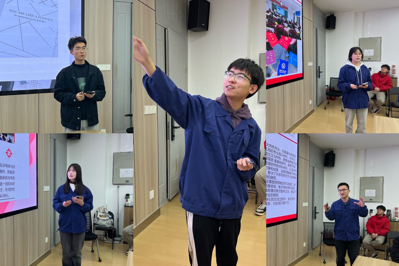 交流会上,曾就读于四川宜宾市第一中学、陕西汉中龙岗学校、河南省实验中学、安徽定远英华中学、新疆乌鲁木齐市第七十中学的刘家铭、李昕怡、杨晨、孔雨萌、王昊烨等同学,围绕实践主题,分别从家乡及高中母校情况、特色做法、家乡学子反响、个人实践心得等方面,分享了本次意义非凡、成效突出的实践经历。一张张生动的照片、一段段有趣的故事展现着西电材料人的自信、自豪和奋发有为的精神面貌,展现着西电人爱校、荣校、兴校的责任担当。在座谈环节,同学们争先发言,师昌绪电子材料菁英班朱晓萌同学讲述了招生宣讲对大山学弟学妹们启梦、追梦、圆梦的引领作用,邢文卓同学讲述了小镇学子们对学院“一对一导师制”培养制度的憧憬和期待等场景。