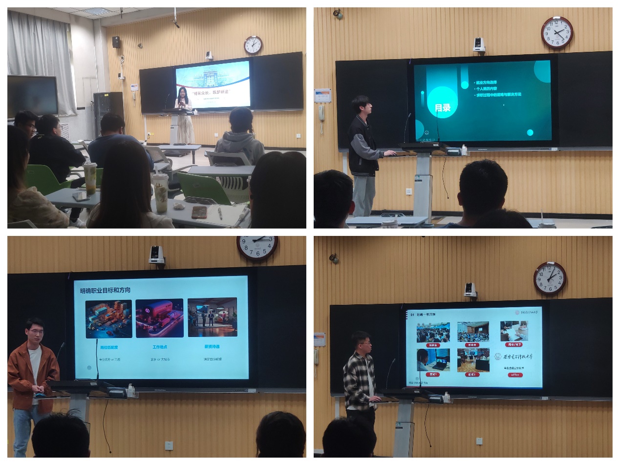 签约中电集团七七一研究所的刘智辉同学结合求职经历,围绕招聘信息获取、招聘一般流程、简历制作、求职与面试经验等四方面展开讲述自己的求职经验与心得体会。他侧重讲解求职与面试经验部分,例如,在参与多家公司的简历投递与面试时,可将信息汇总制作成一个表格,方便随时回顾求职进度,避免错过重要时间节点。他重点讲到同学之间要相互交流,互相分享就业信息,不要把同学当成自己的竞争对手等。