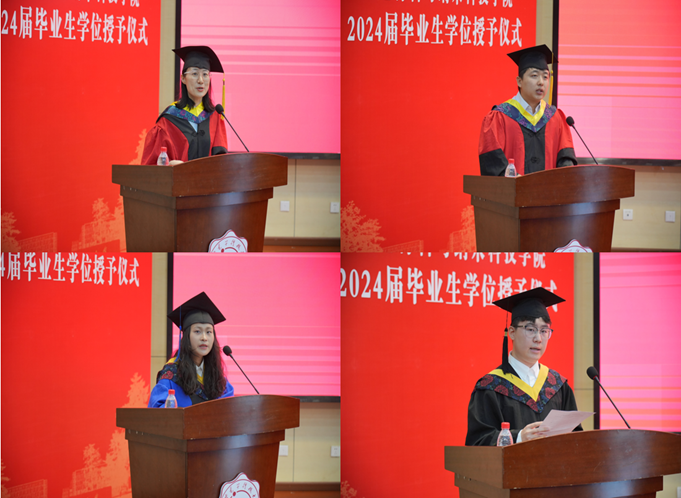 教师代表董广志对毕业生们表达衷心的祝贺。他祝愿各位同学在未来的人生路发扬西电的光荣传统,在新时代、新征程中施展抱负、建功立业。毕业生代表程梦迪同学和王磊同学分别作为2024届的研究生代表和本科生代表,向学校、学院以及所有老师致以衷心的感谢。程梦迪表示,将带着过去三年在西电塑造的优良品格、锻炼出的过硬本领、学习到的宝贵知识,踏上新的人生征程,用实际行动书写属于新时代西电材料学子的华彩篇章。王磊表示:“作为西电材料人,将肩负起时代重任,带着母校的期望、老师们的教诲、朋友和亲友的鼓励,砥砺前行,勇攀电子材料高峰,以青春之名,赴时代之约。”