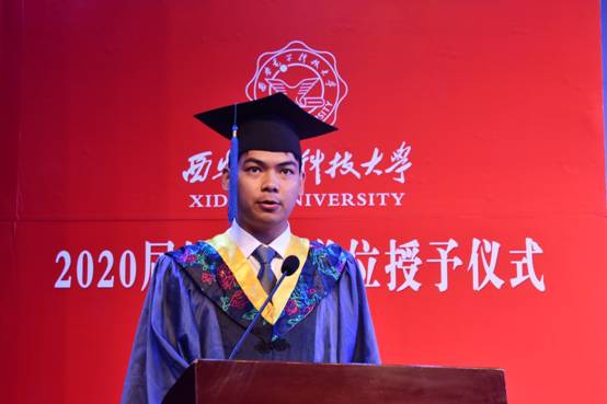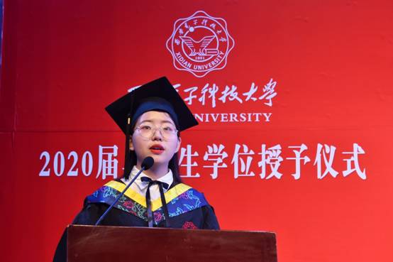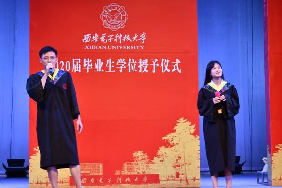 本科生岳新、硕士研究生党丙杰分别代表毕业生发言。在发言中,他们回忆了在校期间与老师、同学之间一幕幕难以忘怀的时刻,有刚入学对校园生活的憧憬,有多年生活的点点滴滴逐渐升华的强烈情感,有在求学期间的收获与成长,几年的西电求学生涯,终将为每一位毕业学子刻上深深的西电烙印。不忘初心,砥砺前行,他们代表2020届毕业生感谢母校、学院以及辛勤付出的老师们的培养和帮助。