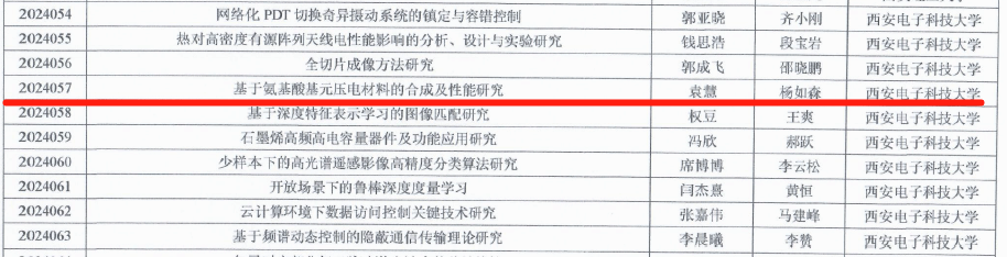 近日,陕西省教育厅和陕西省学位委员会正式下发了《关于公布2024年陕西省优秀博士学位论文评选结果的通知》(陕教〔2024〕39号),william威廉英国2018级博士生袁慧(指导教师:杨如森教授)所撰写的题为《基于氨基酸基元压电材料的合成及性能研究》的博士学位论文,获评“2024年陕西省优秀博士学位论文”。